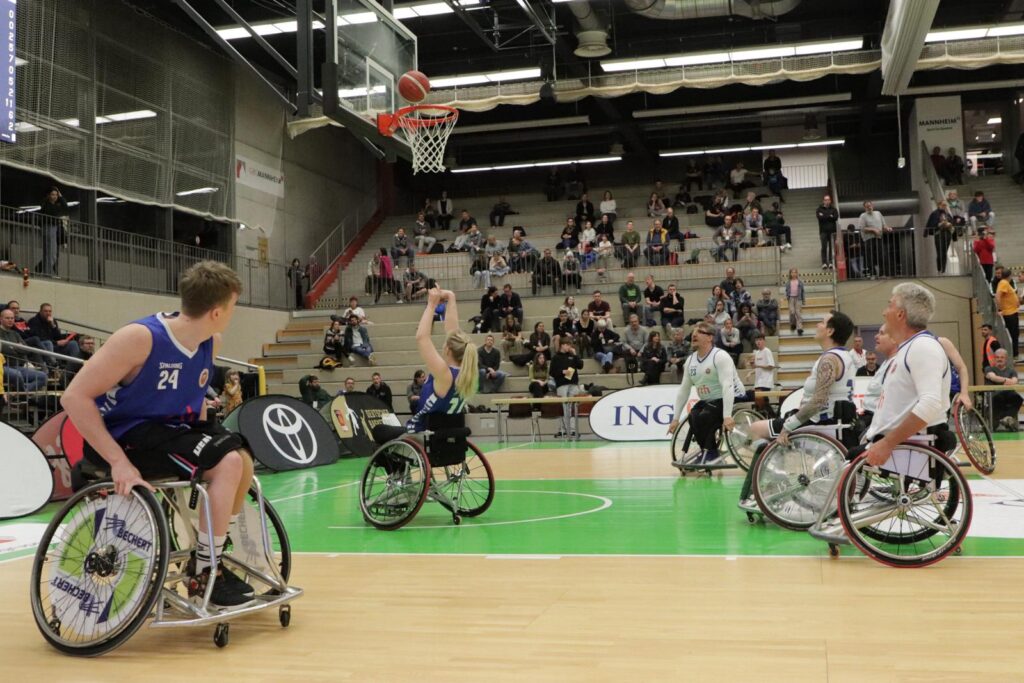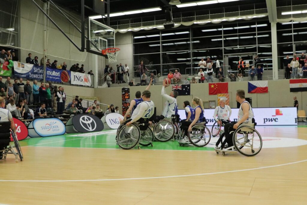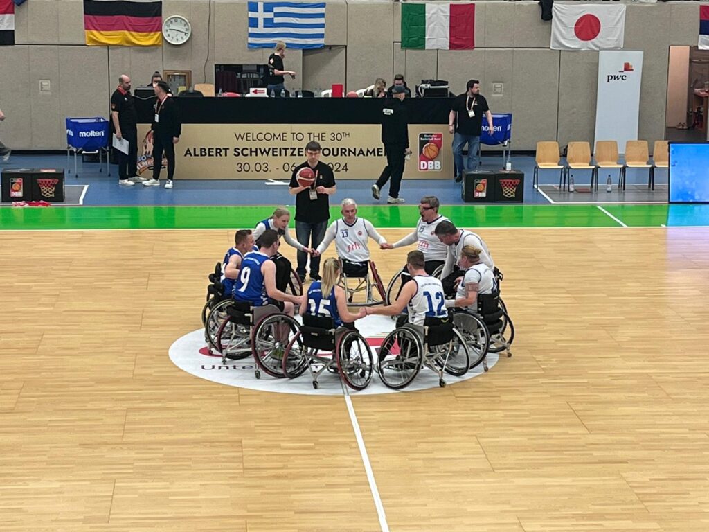 Die lokalen Stars im Rollstuhlbasketball, die Rolling Chocolate, durften ebenfalls beim Albert-Schweitzer-Turnier zwei Showspiele in Halbzeitpausen zeigen, um den vielen Zuschauenden die inklusive Variante des Basketballs näher zu bringen. Beim Spiel Deutschland – Australien und beim Spiel Deutschland – Japan konnten wir jeweils für etwas über 5 Minunten internationale Basketballluft auf tollem Parkett schnuppern. Es war ein großer Spaß!
